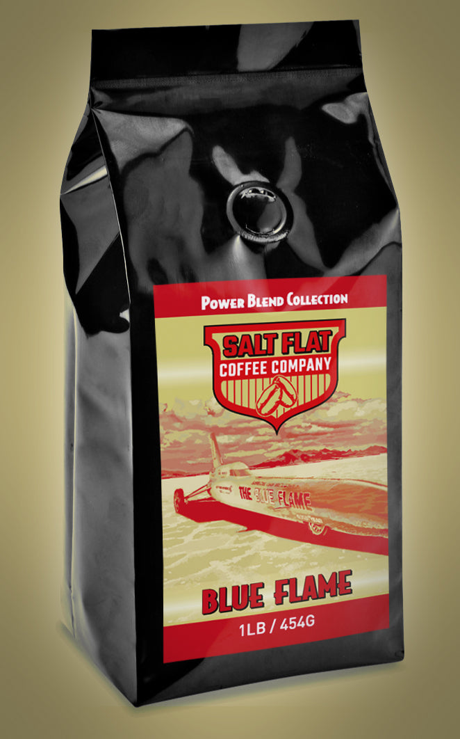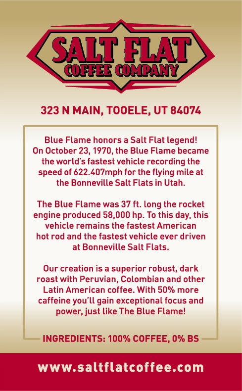 Blue Flame honors a true Salt Flat Legend! A superior, robust dark roast with Peruvian, Colombian and other Latin American Coffee. With 50% more caffeine, you'll gain exceptional focus and power, just like The Blue Flame!